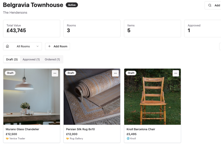 Organise items by project and room. Share selections with clients, keep decisions visible, and reduce back-and-forth.